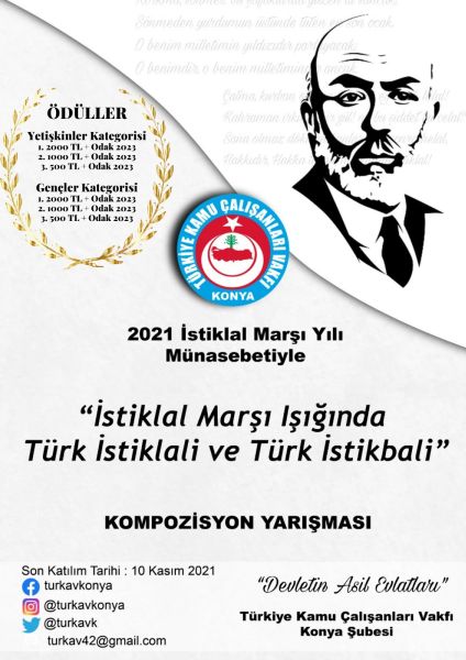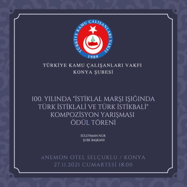 TÜRKAV Genel Başkanımız Sayın Ebubekir Korkmaz ve Genel Merkez Yöneticilerimiz, TÜRKAV Konya şubemizin düzenlediği, 100. yılında “12 Ay 12 Etkinlik” projesi kapsamında düzenlenen “İstiklâl Marşı Işığında Türk İstiklâli ve Türk İstikbali” konulu kompozisyon yarışması ödül törenini katıldılar.